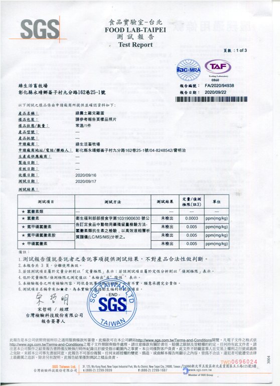 綠農土雞兒雞蛋2020/09/22的檢驗報告